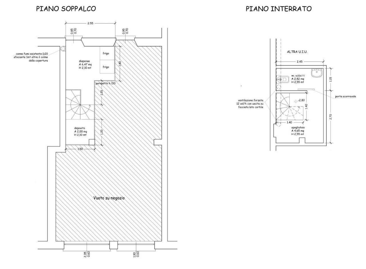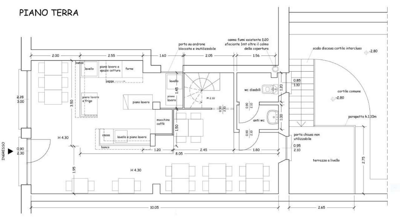 L'immobile si sviluppa su tre livelli, area di somministrazione al piano terra con bagno clienti a norma, al piano interrato spogliatoio con piccolo bagno per il personale e area deposito, soppalco per zona magazzino.