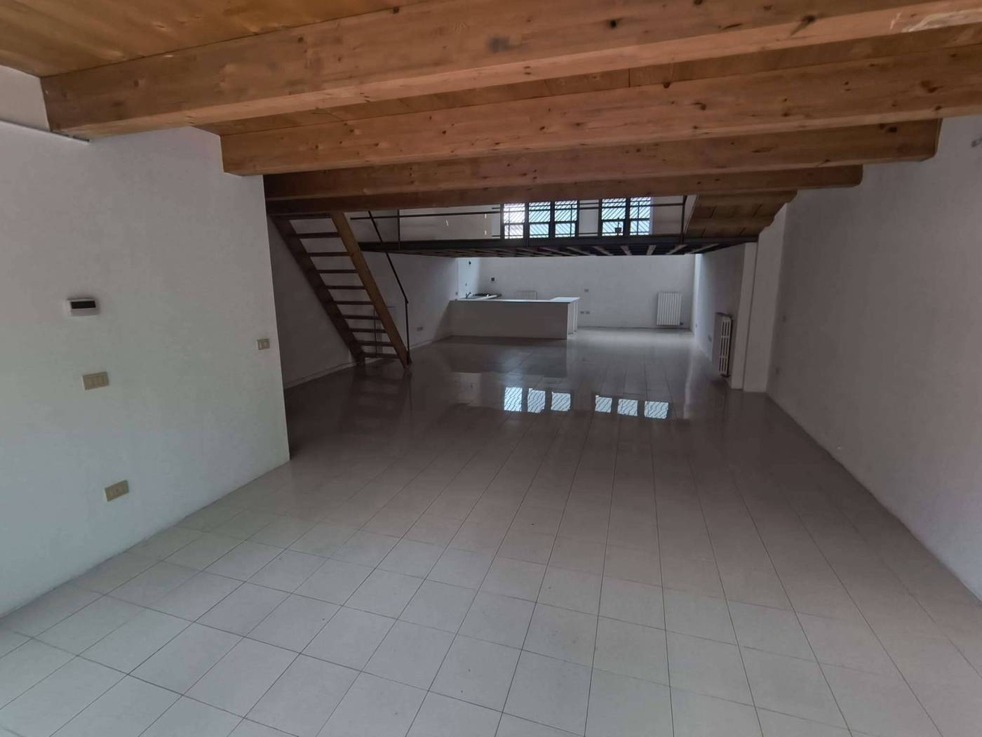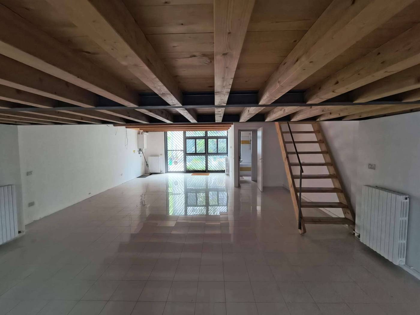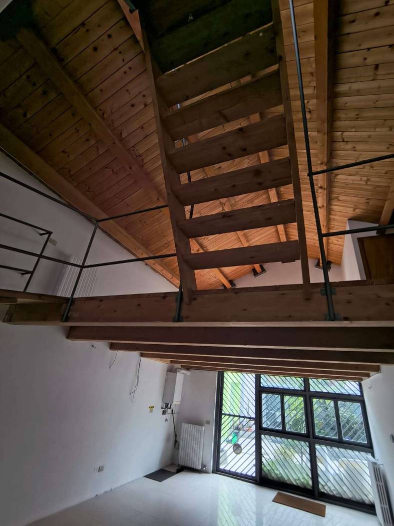 Così composto : grande open space con ampie vetrate, angolo cottura, bagno, scala in legno che porta a due ampi soppalchi collegati tra di loro, bagno, accesso con scala al terrazzo di circa 50 mq